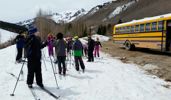 The 5th and 6th grade classes embark on an annual trip to ski Ironton Park just below Red Mountain Pass. We are able to outfit up to 25 students in proper fitting gear so they can enjoy a day learning to ski with their friends. This year marks the 9th consecutive year that we have taken our younger students out.