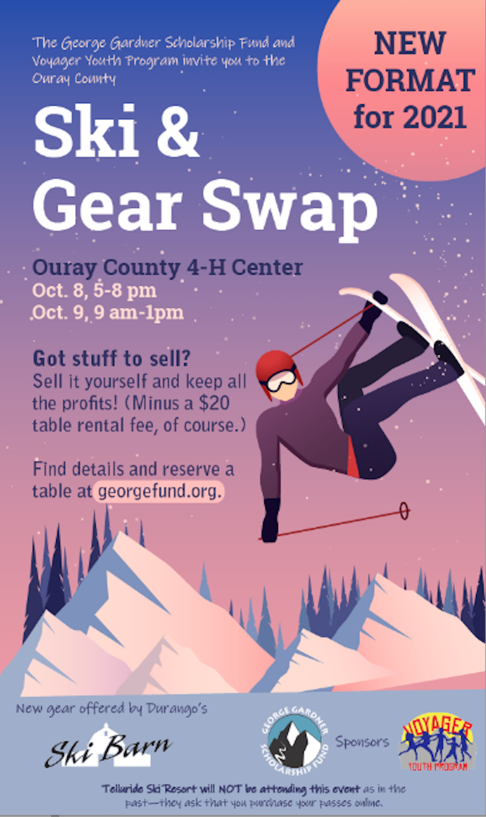 Jorge Gardner Scholarship Fund & Voyager Youth Program ~ Ski & Gear Swap TOMORROW & SATURDAY … October 7, 2021 by Jerry Roberts, posted in News and Events Share this: Click to share on Facebook (Opens in new window) Facebook Click to email a link to a friend (Opens in new window) Email Like Loading... Related