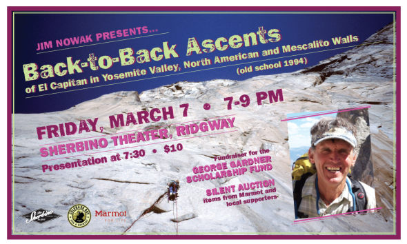 RIDGWAY – Friday, March 7, Jim Nowak of Ridgway gives a presentation about his back-to-back “old school” ascents of El Capitan’s North American and Mescalito Walls, way back in 1994.
